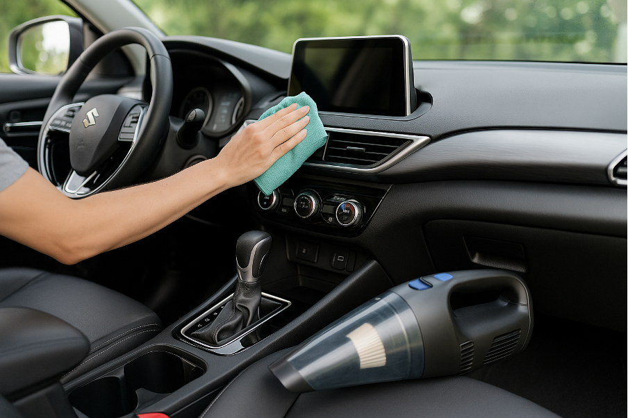 Gunakan lap microfiber lembap untuk angkat debu tanpa merusak permukaan. - Vakum karpet dan jok minimal seminggu sekali